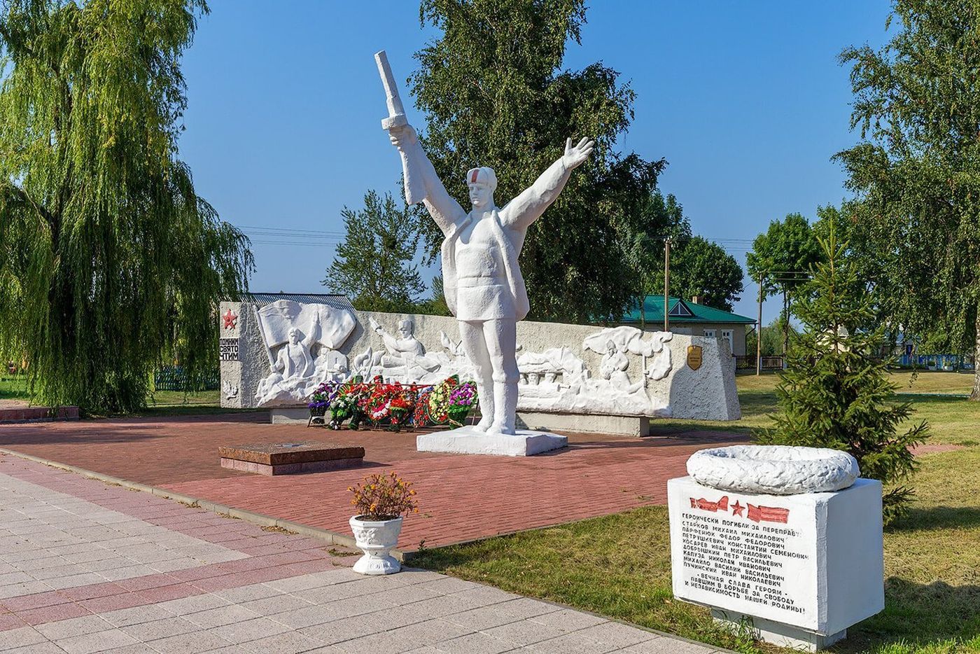 В центре комплекса возвышается шестиметровая фигура партизана с поднятыми в победном жесте руками, символизируя обобщённый образ народа-победителя. За спиной фигуры дугообразная стена с барельефным панно, на котором запечатлены эпизоды обороны. Справа от скульптуры находится трехгранный блок с именами погибших и лавровым венком.
