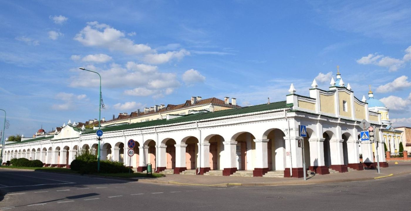 Построенные в XIX веке торговые ряды в Пружанах отличаются эклектичным архитектурным стилем с элементами позднего классицизма и барокко. Ключевой особенностью постройки являются арочные галереи, окружающие здание, а также четыре декоративных фронтона. Несмотря на свою историческую ценность, эти «белые лавки» по-прежнему используются для размещения магазинов.