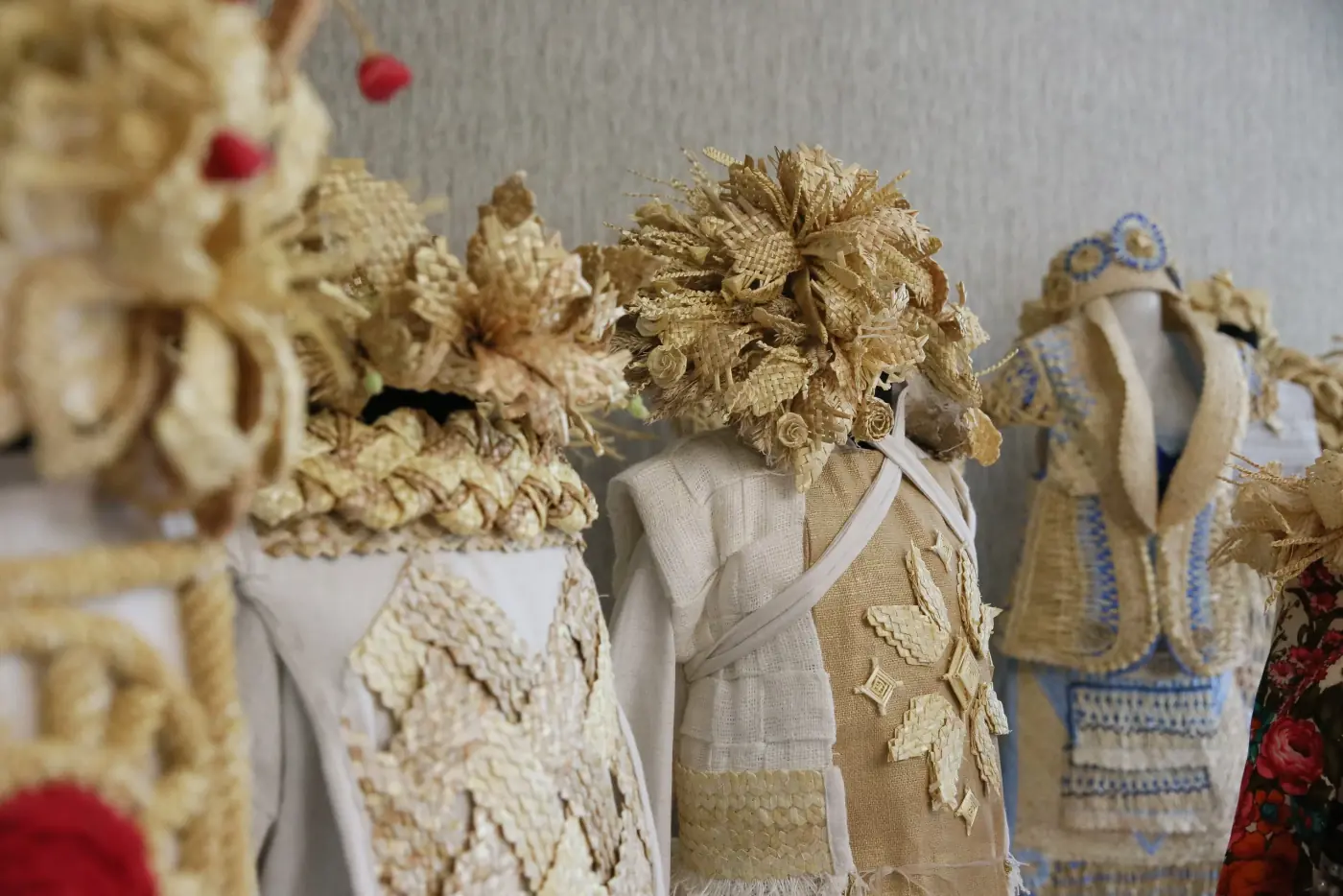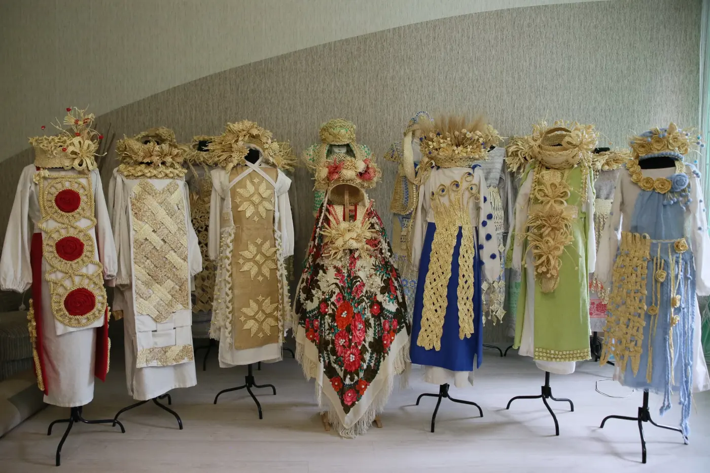 Учащиеся народной студии соломоплетения «Натхненне» под руководством педагогов занимаются не сувенирной работой, а созданием исключительно костюмов из соломы. Ребята каждое лето выезжают в поле, где вручную жнут рожь или пшеницу, из стеблей которых потом создают необычные и удивительные по красоте национальные костюмы. Сначала изготавливают элементы, затем объединяют их в оригинальные предметы одежды.