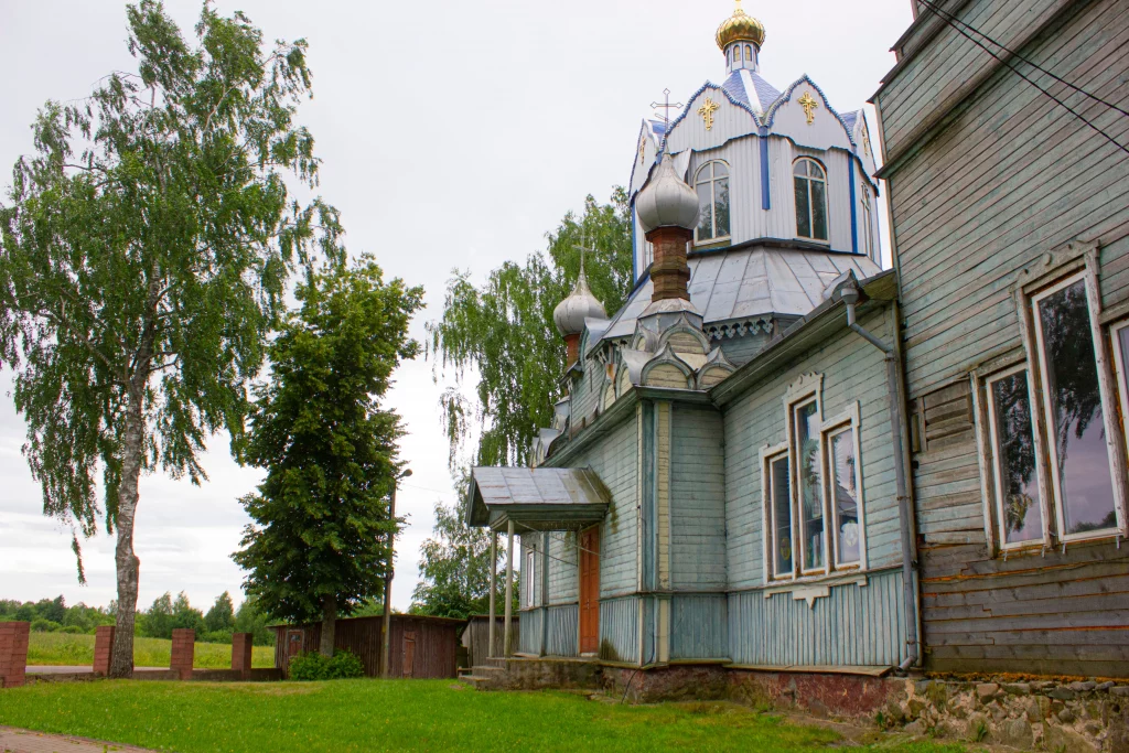 Памятник деревянного зодчества построен в 1894 году в 10 км от райцентра в небольшой деревне Худовцы. В 1888 году император Александр III и его семья попали в страшную аварию. Поезд сошел с рельсов, погибли тогда человек двадцать, но царская семья не пострадала. В память об этом на пожертвования прихожан была построена эта церковь. Уцелела она и во время войны. Говорят, немцы однажды хотели забрать золотой крест с купола, вырвали и сбросили его на землю, но он чудесным образом куда-то исчез…