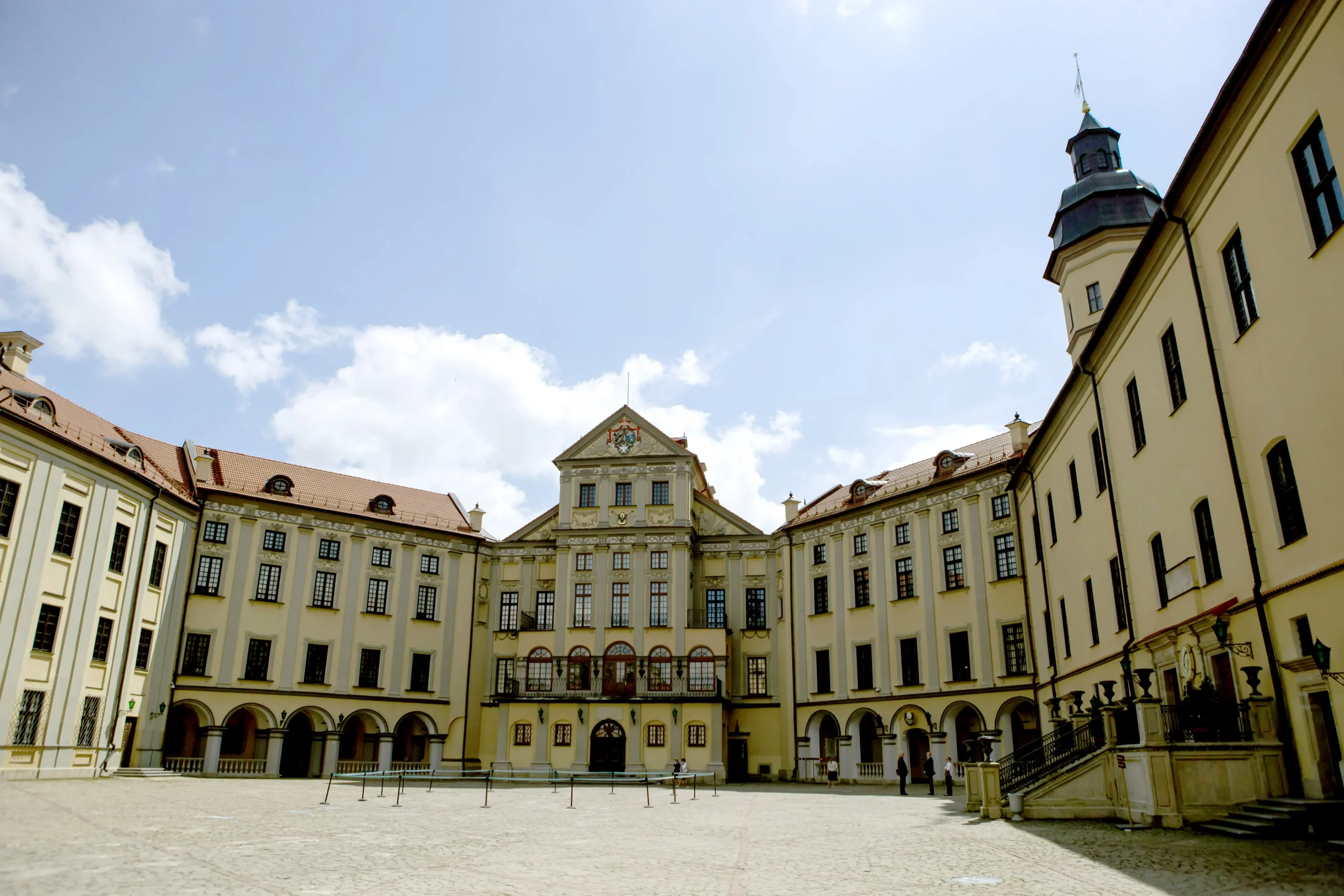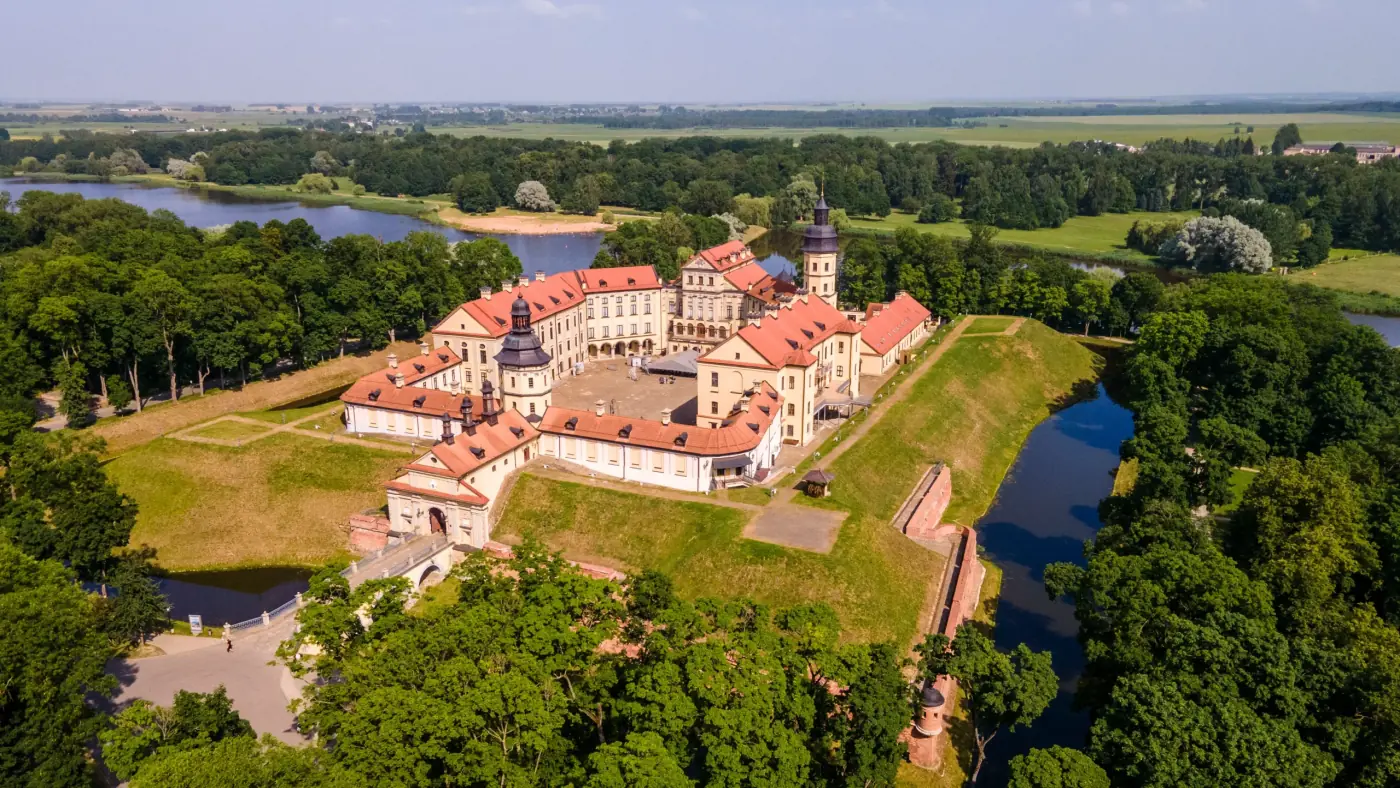 Без преувеличения можно назвать туристической меккой Минщины. Начало его строительства относится к 1583 г. В ХVII в. по углам бастионов были возведены 4 оборонительные башни. Вдоль главной оси находились каменные ворота с подъёмным мостом и 3-х этажный дворец с 8-мигранными угловыми башенками. В комплекс замковых построек входили двухэтажный хозяйственный корпус, трехэтажная казарма с дозорной башней, дом городничего, пекарня, конюшня, литейная мастерская. Строительство и перестройка дворцово-замкового ансамбля велась в ХVI-ХIХ вв., поэтому в нём сочетаются приёмы средневекового зодчества со стилями позднего ренессанса, барокко, классицизма и самобытное искусство местных мастеров. За время своего существования, замок выдержал осады русских войск в 1655 и 1660 гг., но в 1706 г. был взят шведами, которые разрушили замковые постройки и бастионные укрепления. Во второй половине ХVIII — первой половине ХIХ вв. замок неоднократно осаждали русские войска (1764, 1768, 1772, 1773, 1812 гг.). После событий 1812 г. замок находился в запущенном состоянии до 1875 г. Масштабные реставрационные работы начали проводить только в последней четверти ХIХ — начале ХХ вв. под руководством Марии Дороты де Кастелян Радзивилл. Под охрану государства дворец был взят в 1939 г. В 2001 г. Дворцовый ансамбль передан на баланс Национального историко-культурного музея-заповедника «Несвиж», в 2012 году завершены реставрационные работы и для посетителей открылись экспозиционные залы. Заказать экскурсию.