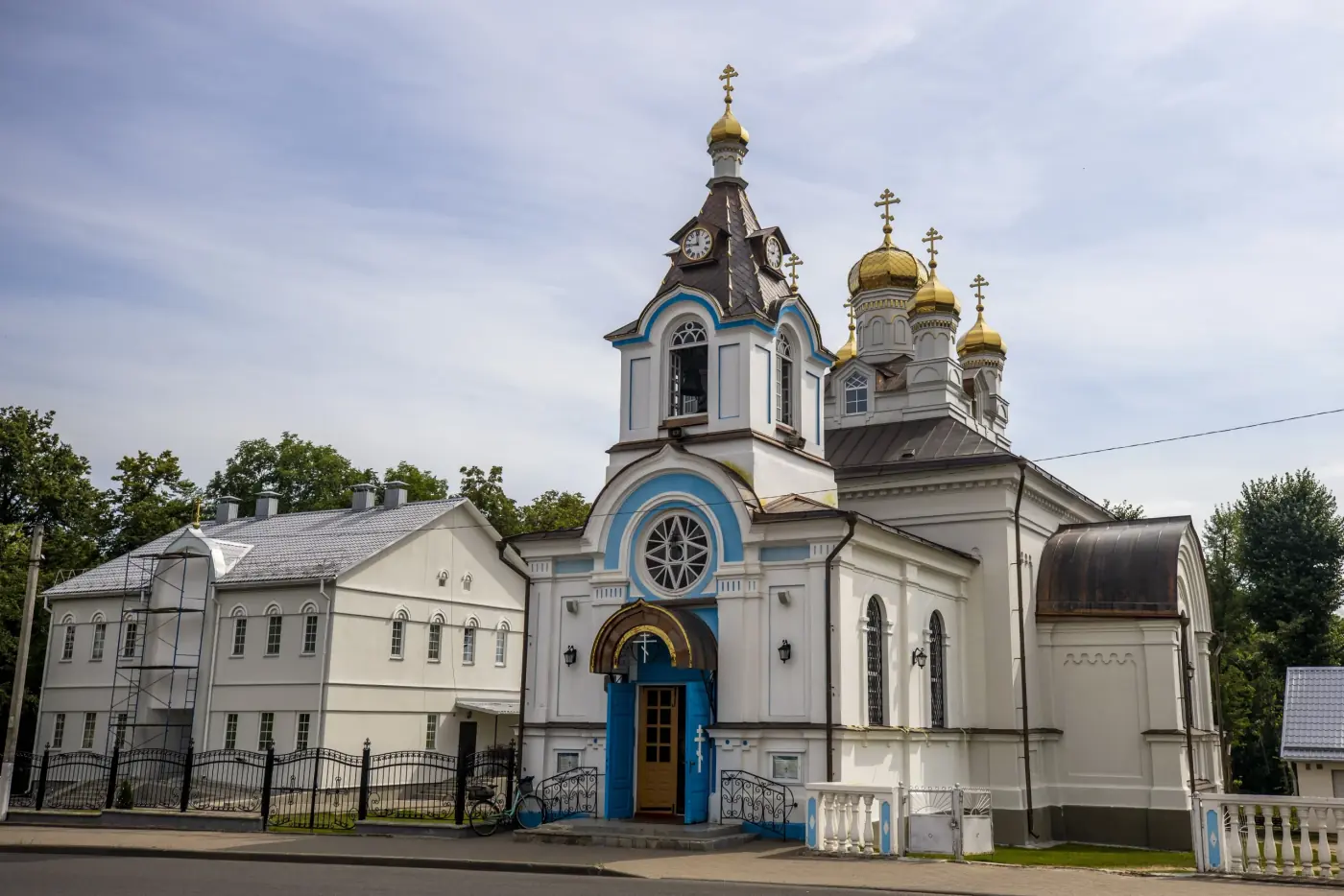 Храм небесно-голубого цвета построен в 1865 году и стилизован под древнерусское зодчество. Имеет башенные часы, циферблаты которых направлены в разные стороны.